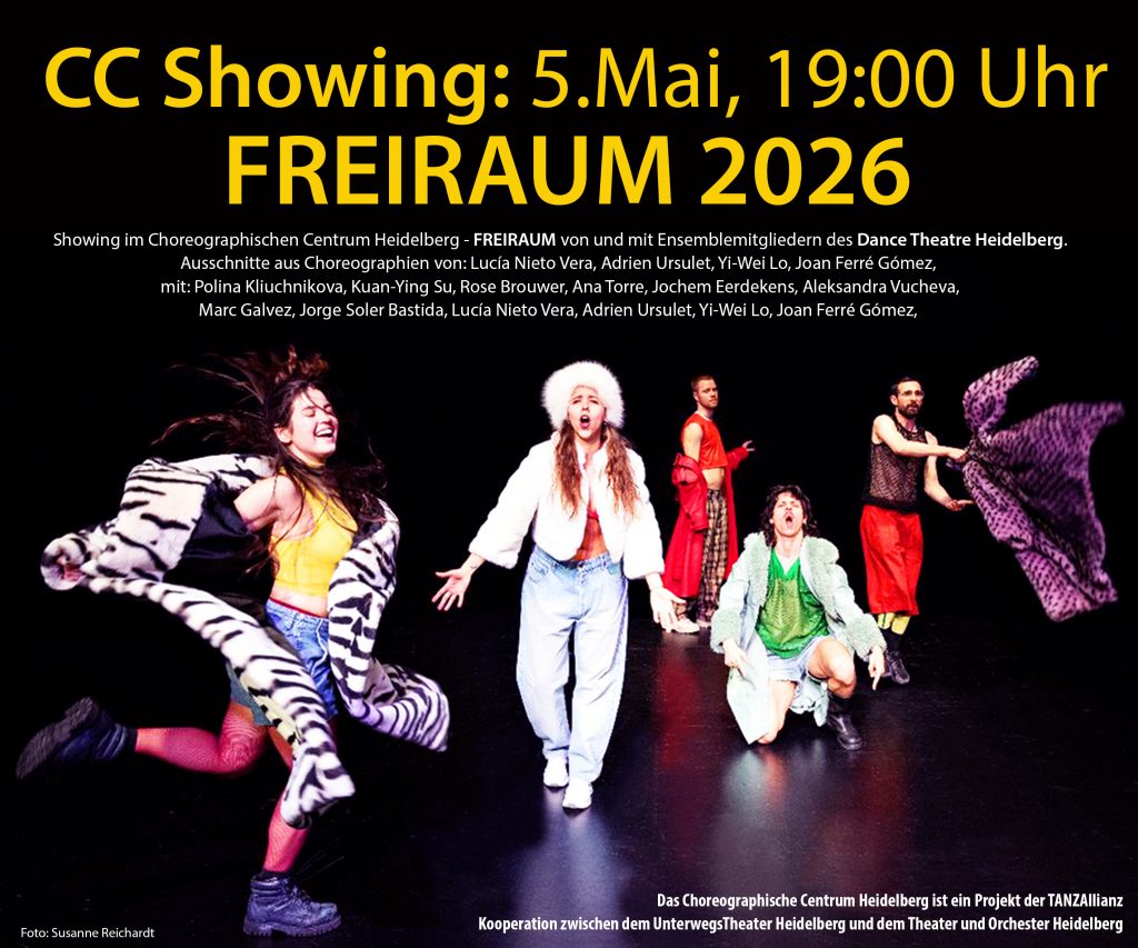 FREIRAUM von und mit Ensemblemitgliedern des Dance Theatre Heidelberg. Im Rahmen der Tanzallianz, der bundesweit einmaligen, langfristigen Koope- ration zwischen UnterwegsTheater und Theater und Orchester Heidelberg, öffnet das Choreographische Centrum die Türen für TänzerInnen des DTH und ermöglicht die Entwicklung von choreographischen Werken für die Abschiedsproduktion dieser Spielzeit, Freiraum 2026. Bereits vor der Premiere geben sie im Rahmen eines Showings am 5. Mai um 19 Uhr exklusive Einblicke in ihre Recherche- und Probenprozesse mit anschließendem Künstler*innengespräch. Der Eintritt zu allen CC-Showings ist frei!